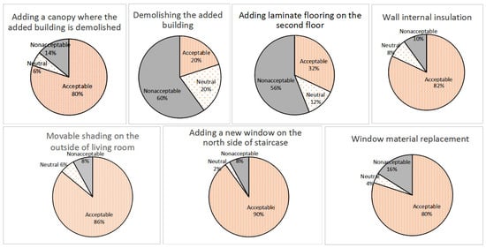 To understand the degree of acceptance of the indoor environment renovation measures by immigrants, 50 immigrants were randomly selected for interviews and questionnaires via stratified random sampling. Fifty questionnaires were recovered. Among the surveyed people, those over 60 years old accounted for more than 70% of the sample. The survey content is the acceptability of various optimization measures and costs. The survey content is divided into three categories: “Nonacceptable”, “Neutral”, and “Acceptable”.