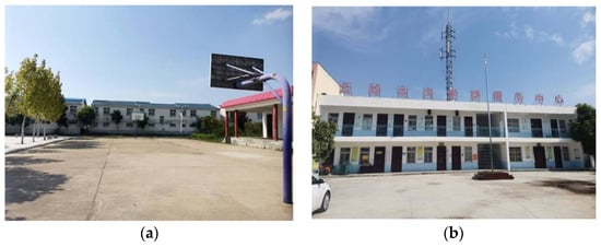 Public service facilities in Yunyu New Village. (a) Stage + basketball court; (b) Party–mass service center.