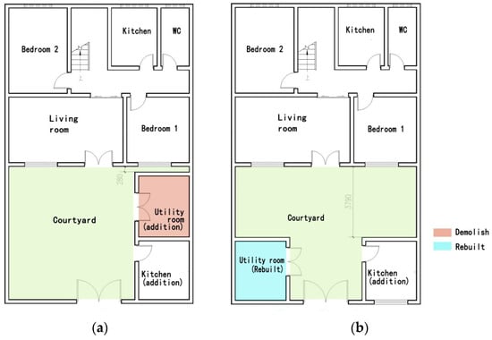 Floor plans of courtyard spaces of the north-south house type before (a) and after (b) renovation.