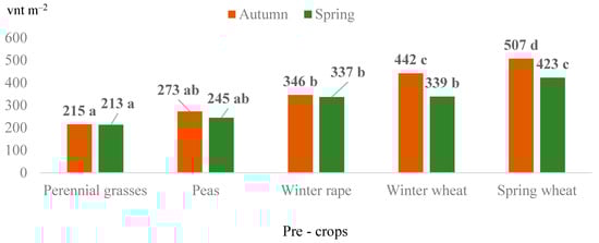 According to Šuliauskas [13], winter wheat is best sown after peas, beans, winter rape, and spring rape. It also thrives when sown after spring wheat, whose pre-crop is winter rape. According to Romaneckas [14], winter wheat is considered a soil-depleting agricultural crop, and if sown after spring wheat, it may become susceptible to root diseases. Therefore, from a crop rotation perspective, the most suitable pre-crops for wheat are soil-improving plants such as legumes and perennial grasses. According to data from the Lithuanian Institute of Agriculture, spring barley is a better pre-crop for reducing weediness in winter wheat than peas, winter rape, and winter wheat. The number of plants that did not overwinter was determined.