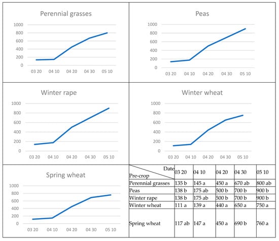 After evaluating the different plant emergence rates, it was found that significantly more plants, ranging from 37.86% to 57.59%, were present after pre-crops of winter rape, winter wheat, and spring wheat compared to perennial grasses, and from 21.10% to 46.15% compared to peas (Table 7).