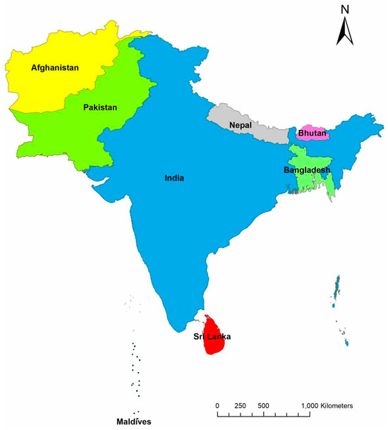 South Asia is a diverse and vibrant geographical landscape located in the southern part of Asia, encompassing the specified countries of Nepal, Bhutan, Bangladesh, Pakistan, Sri Lanka, India, Afghanistan, and Maldives (Figure 1). The region is located at 25.0376 N 76.4663 E and comprises around 5.1 million km2, about 11.5% of the Asian continent and 3.4% of the world’s land surface [8,38]. The northern boundary of South Asia is defined by the major Himalayas, which stretch across several countries, including India, Nepal, Bhutan, and Pakistan. The vast and fertile Indo-Gangetic Plain lies to the south of the Himalayas and is one of the most densely populated regions in the world. This plain is watered by the Ganges, Brahmaputra, and Indus Rivers, which provide water for agriculture and support millions of livelihoods. South Asia experiences a range of climates, from hot and humid plains to cold and snowy Himalayan peaks. Monsoon rains arrive in summer and are crucial for agriculture; however, they can also cause devastating floods. This region is home to some of the world’s most populous cities including Delhi, Dhaka, and Karachi. These countries were selected based on the information outlined in the abstract, reflecting the regional diversity of topography, climate, and socioeconomic factors that influence flood disaster management.