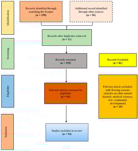 PRISMA-based systematic review process used in this study. Initially, 150 records were identified through a search of the Scopus database, with additional 56 records identified from other sources, resulting in a total of 206 records. After removing duplicates, 195 records remained for screening. During the screening phase, 81 articles were excluded, resulting in 94 full-text articles that were assessed for eligibility. Of these, 20 were excluded for reasons such as focusing on other natural hazards, the medical sciences, law, or community development. Finally, 94 studies were included in the final review. The dashed boxes represent the numbers of papers being selected through the review process.