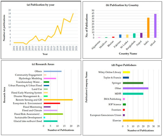 Devastating flood events in Bangladesh, Afghanistan, Nepal, and India during 2010–2015 and, most recently, in Pakistan in 2022, have led to an increase in academic interest in conducting research on RS- and GIS-based flood disaster studies, particularly after 2014 (Figure 3a). By 2023, the peak of this research was 18 publications per year. This increasing number of citations illustrates South Asia’s growing trend in flood disaster research. As an individual entity, most publications were from India, about 37 (Figure 3b).