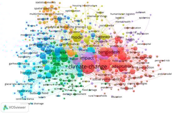 Keywords map. This illustrates the co-occurrence of keywords with a minimum occurrence of five in publications from 2004 to 2024. The map depicts clusters of frequently occurring keywords, highlighting the main research focus areas. Prominent keywords such as “climate change”, “impact”, “adaptation”, “Bangladesh”, and “model” are shown with larger nodes, indicating higher occurrences and centrality within the network. The map visually represents the interconnectedness of various research topics, emphasizing significant themes, such as social vulnerability, precipitation, rainfall, flood risk, and health.