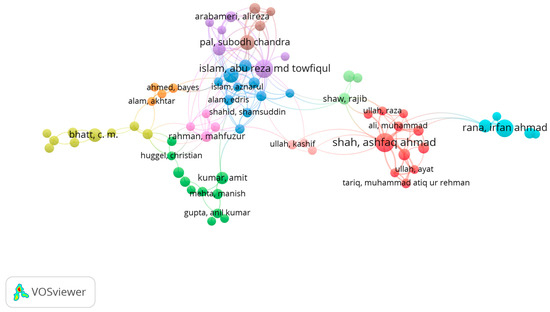 The objective of citation analysis is to identify the most frequently cited research articles on this topic [58]. The study titled “A typology of compound weather and climate events by [1] garnered the highest number of citations, totaling 669, according to the analysis (Table 4). Then, Sanyal & Lu’s “Application of remote sensing in flood management with special reference to monsoon Asia: A review.” published in 2004 had the second highest number of citations, totaling 621. Furthermore, a research paper written by Bassi et al. (2021) [59] entitled “Status of wetlands in India: A review of extent, ecosystem benefits, threats, and management strategies” ranks third in terms of the highest number of citations, amounting to 551 according to the analysis. Bibliometric analysis identified 11 clusters that met a minimum of five documents per author (Figure 5). According to the documents per author, citations, and link strength, Islam, Shah, and Rana were the main authors in the author cluster (Table 5).