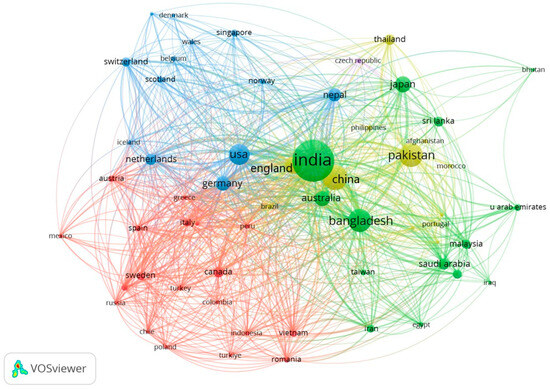 Network map of citations by country that highlights the citation relationships among countries from 2004 to 2024. Key countries, such as India, the USA, Germany, and Bangladesh, are prominent, indicating high citation frequency and centrality within the network. Different colors represent distinct clusters of countries that frequently cite each other’s work, illustrating global collaboration and influence in the research community.