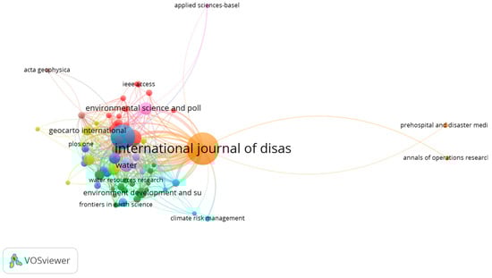 Map of citations by journal. The map depicts the citation relationships among various academic journals from 2004 to 2024. The “International Journal of Disaster Risk Reduction” was prominent, indicating a high frequency of citations and centrality within the network. Other significant journals include “Environmental Science and Pollution Research”, “Water Resources Research”, and “Geocarto International”. Different colors represent distinct clusters of journals that frequently cite each other’s work, illustrating the interconnectedness and influence among journals in the research community.