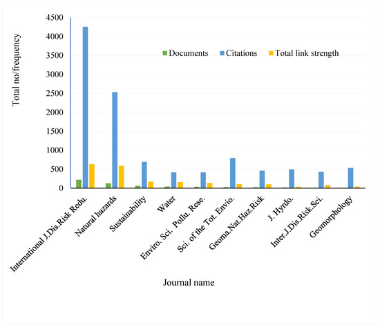 Statistics for the top 10 journals in terms of citations and total link strength as of 16 January 2024. The graph compares the number of documents, citations, and the total link strength for each journal. Notably, the journal “Natural Hazards” has the highest number of citations, followed by “Sustainability” and “International Journal of Disaster Risk Reduction”. The bars indicate the frequency of documents (yellow), citations (green), and the total link strength (brown) for each journal.