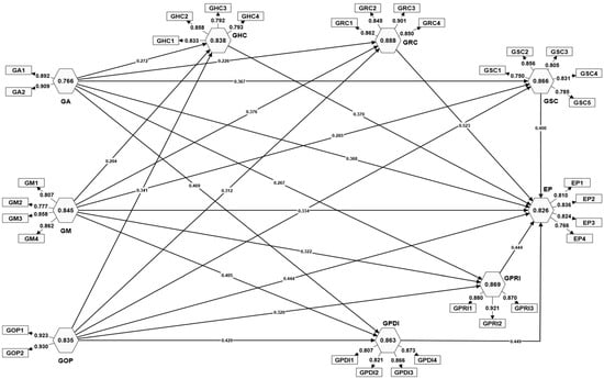 The first stage used the coefficient of determination (R2) and the cross-validated redundancy index (Stone–Geisser’s Q2) for the predictive relevance of the structural model. Table 8 presents the R2 and Q2 values for GIC (0.213, 0.204), EP (0.398, 0.223), and GIN (0.278, 0.269). The ranges of R2 between 0 and 1 with a higher value represent a higher level of predictive accuracy.