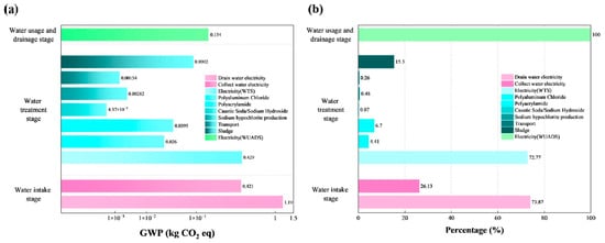 The carbon emissions from the water intake and water usage and drainage stage are primarily driven by electricity consumption. The carbon emissions from the water treatment stage are mainly derived from three sources. Among them, carbon emissions from electricity consumption are 4.29 × 10−1 kg CO2 eq, accounting for 73%; carbon emissions from chemical consumption are 7.16 × 10−2 kg CO2 eq, accounting for 12%; and carbon emissions from sludge treatment are 9.01 × 10−2 kg CO2 eq, accounting for 15%. Similar to the results of Çapa et al. [43], electricity consumption is the primary influencing factor in the water treatment stage. At the same time, the emission of GHG is also related to the amount of sludge treatment [44].