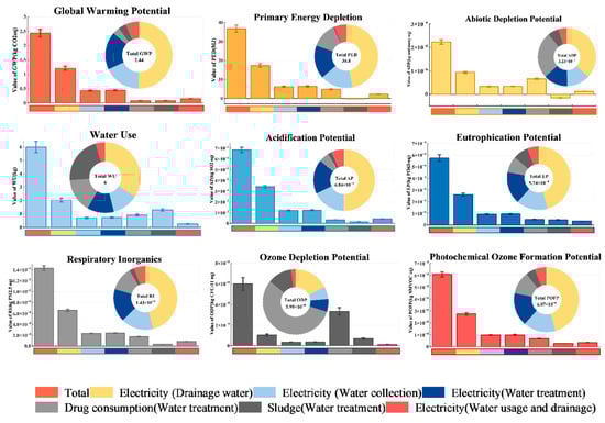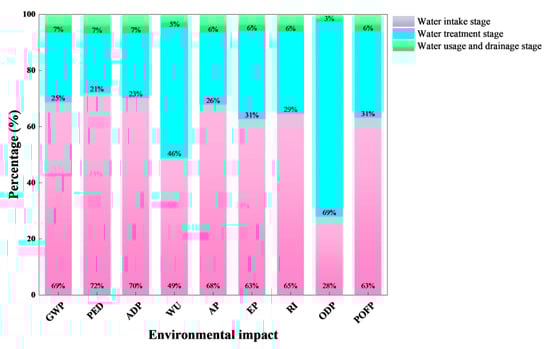 The findings of the data suggest that the water intake stage has the greatest impact on all environmental impact categories. The water intake stage contributes over 60% to the values of PED, ADP, AP, EP, RI, and POFP. This is caused by the pumps that are being used to extract water from underground, which consume a large amount of electricity and increase the corresponding contributions to environmental impact categories. The electricity and chemical consumption during the water treatment stage also significantly contributes to the environmental impact, constituting 71% of the ODP indicator. ODP refers to ozone depletion potential. ODP mainly results from the use of chemicals in water treatment, which is consistent with Mirtes’s description [45].