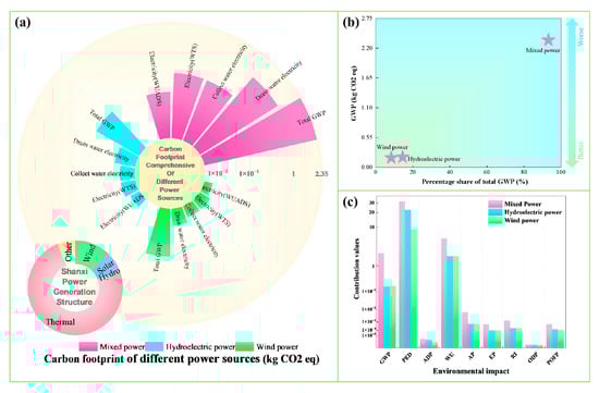 This study establishes a comprehensive evaluation method for three types of power generation based on LCA. The carbon emissions and other environmental impact factors of electricity consumption in the three stages of mine water comprehensive utilization were calculated and analyzed, as Figure 6. The comprehensive analysis of carbon footprints indicates that wind power has the least impact on carbon emissions and other environmental factors, followed by hydropower. As shown in Figure 6a, compared to the substitution of hydropower and wind power, the GWP decreases from 2.35 kg CO2 eq to 0.188 kg CO2 eq and 0.175 kg CO2 eq, with reductions of 92% and 92.5%, respectively. The values of other environmental factors also decrease significantly, with reductions exceeding 70% for categories such as AP, EP, RI, and POFP. This demonstrates that compared to conventional thermal power, hydropower and wind power generation significantly contribute to the reduction of carbon emissions, as anticipated. Moreover, these renewable energy sources exert a beneficial influence on various environmental factors.