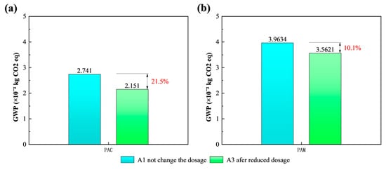 The comparison of the GWP value after reduced dosages of PAC (a) and PAM (b).