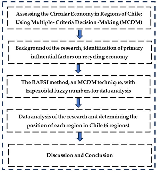The research process is carried out and employs a descriptive–analytical approach, conducting a comparative analysis of the six regions based on nine waste-related indicators. The Rank Alternative by Fractional Separation of Ideal Solutions (RAFSI) method, a multi-criteria decision-making (MCDM) technique, was used with trapezoidal fuzzy numbers for data analysis. A sensitivity analysis was employed to ensure the robustness of the results and determine the range of variation and flexibility of the model. The research process is illustrated in Figure 1.