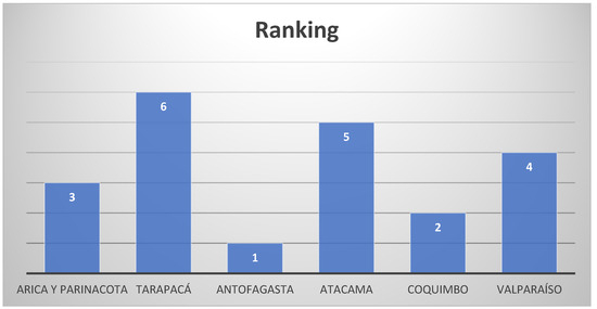 The Tarapacá region ranked last (sixth) based on the nine waste-related indicators influencing the circular economy. This region performed below the average of the six regions in six indicators: Percentage of National RSDyA Generation (Generation of RSDyA (tons/year) 2017), Generation of Municipal Waste per Inhabitant, by Region (2021), Generation of Non-Hazardous Industrial Waste, by Region (2021), Tons per Million Pesos of GDP, Tons of RSD in Active Final Disposal Sites, by Region (2019) (Dump), and Tons of RSD in Active Final Disposal Sites, by Region (2019) (Sanitary Landfill). However, it outperformed the average of the six regions in three indicators: Generation of Municipal Waste, by Region (2021), Tons of RSD in Active Final Disposal Sites, by Region (2019) (Manual Landfill), and Tons of RSD in Active Final Disposal Sites, by Region (2019) (Landfill). The ranking of the regions in northern Chile is based on both the weight of each criterion and the volume of data for each region. For example, even if one region has a higher volume of data, it may rank lower than another region. This is because certain criteria carry more weight in the utility function, leading to a higher overall rank for the region with more significant weights. Figure 1 shows the ranking of the cities.
