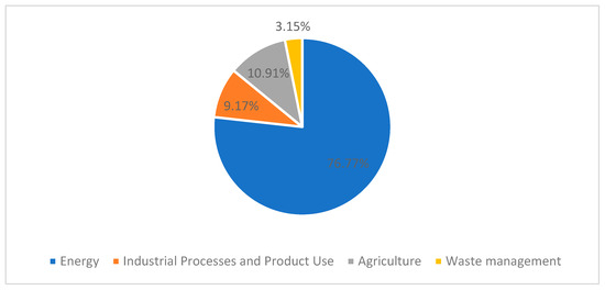 Total EU greenhouse gas emissions in the CO2 equivalent amounted to almost 3.5 billion tonnes in 2021 [5], representing approximately 8.4% of global emissions. Since 1990, these emissions have been reduced by 22%. There have been three periods of increased reductions. The first was in the early 1990s, when political changes took place in Eastern European countries, which resulted in a decline in production in energy-intensive heavy industry. The second period was 2008–2009 when the decline in emissions was related to the global economic crisis. The last of these periods was 2019–2020—the COVID pandemic. The share of individual economic sectors is presented in Figure 1.