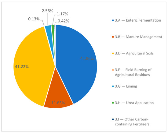 In 2021, Poland emitted almost 400 kt of GHG, which was about 10% of EU emissions. The share of emissions from agriculture was slightly lower than in the entire EU and amounted to 8.5% in 2022 [7]. What is extremely important is that, since 1990, domestic agriculture has reduced emissions by 32% compared to 1988, which was related to structural changes in the early 1990s [8] and a significant reduction in animal production, which in Poland is the dominant emitter of GHG in agriculture. It accounts for over 55% of all emissions (Figure 2).