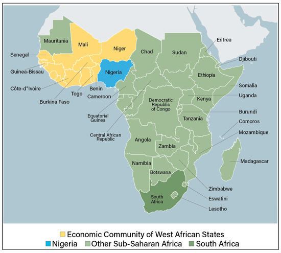According to the authors of [35], SSA is subdivided into five (5) regions. The first (i) is Sudano-Sahelian Africa (Burkina Faso, Chad, Gambia, Mali, Mauritania, Niger, Senegal, Somalia, and Sudan), a region whose vegetation mainly consists of savannahs dominated by grasses and trees, bordered to the south by open forests and to the north by grassy steppes and desert formations. The second (ii) is West Africa (Benin, Côte d’Ivoire, Ghana, Guinea, Guinea-Bissau, Liberia, Nigeria, Sierra Leone, and Togo), which is humid and sub-humid.