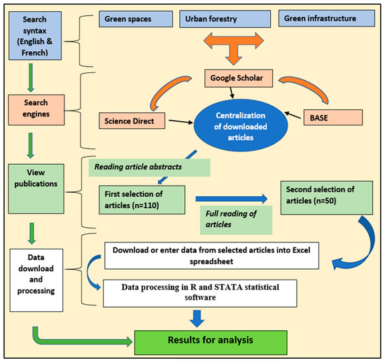 The scientific articles were obtained via a bibliographic search using keywords relating to the theme of urban forestry in search engines such as Google Scholar (https://scholar.google.com), Bielefeld Academic Search Engine (BASE, https://www.base-search.net), and Science Direct (www.sciencedirect.com). The approach used consisted of the following steps: (i) entering keywords relating to urban forestry in the search bar of the above-mentioned websites; (ii) selecting the search language and the documents to be searched; (iii) launching the search engine; and (iv) selecting and downloading the appropriate documents. Only articles published in “French” and “English” were analyzed. For the studies included in the review, we reported information on authors, publication year, countries involved, topics covered, geographic location of urban forestry research, etc.
