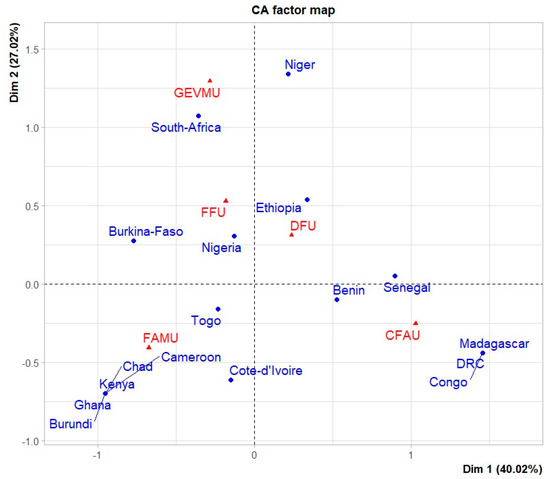 The factorial correspondence analysis indicates a total inertia of 67.04% for both axes (Axis 1 and Axis 2). Axis 1 (40.02% inertia) reflects the geographical origin of the publications, while Axis 2 (27.02% inertia) presents a breakdown of the themes dealt with most. In terms of the topics covered by country, the management of green spaces in urban areas (GEVMU) was mostly addressed in relation South Africa and Niger. The functions of trees (FAMU) were addressed based on Togo, Ghana, Chad, Burundi, Cameroon, Kenya, and the Ivory Coast. The development of urban forestry (DFU) was mostly addressed based on Togo and Benin. The characterization of urban tree flora (CFAU) was mostly addressed based on the Democratic Republic of Congo. The topic of financing urban forestry was only addressed based on Nigeria (Figure 4).
