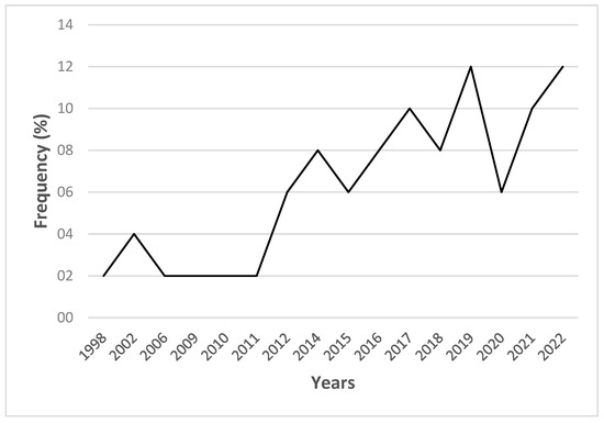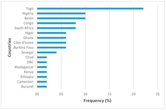 According to the results of our analysis of the selected articles, Togo, Nigeria, Benin, Congo, and South Africa have carried out more work in the field of urban forestry. Togo accounts for 22% of publications, Benin and Nigeria account for 10%, and South Africa and Congo account for 8%. Burundi, Cameroon, Chad, Ethiopia, Kenya, Madagascar, and the DRC carried out little work in the field of urban forestry, with each country amounting to 2% of contributions (Figure 5).