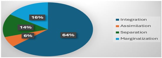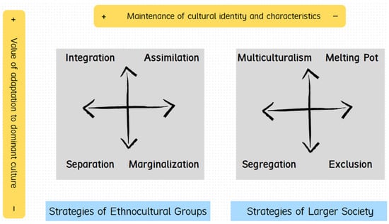 The first strategy, integration, involves the individual aiming to both preserve their culture and adapt to the new one. In assimilation, the individual opts to abandon their culture and fully adapt to the new culture. Those adopting this strategy distance themselves from their cultural identity and fully integrate into the new culture. The third strategy, separation, is adopted by individuals who wish to preserve their culture while avoiding adaptation to the new culture. Marginalisation describes individuals who neither maintain their culture nor adapt to the new culture [4,16,17]. These strategies can also be examined from a social perspective (Figure 1).