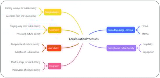 In the first stage, elements in the qualitative dataset that were deemed irrelevant to the research objectives and context were removed. In the second stage, the data were coded. During the coding process, a deductive approach was employed to establish connections between participants’ views and acculturation strategies [4,16,17,38,39,40]. Simultaneously, an inductive approach was used to group related codes under specific categories, which were further organised into new subthemes based on their relationships. Participants’ views were coded ‘R’ for Russian immigrants and ‘S’ for Syrian refugees. In the final stage, various categories, subthemes, and themes were identified. The resulting network of relationships was explained and interpreted.