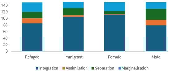Most participants (64%) favoured integration, followed by marginalisation at 16% and separation at 14%. Assimilation was the least preferred strategy. The distribution of acculturation strategies among refugees, immigrants, females, and males is illustrated in Figure 5.