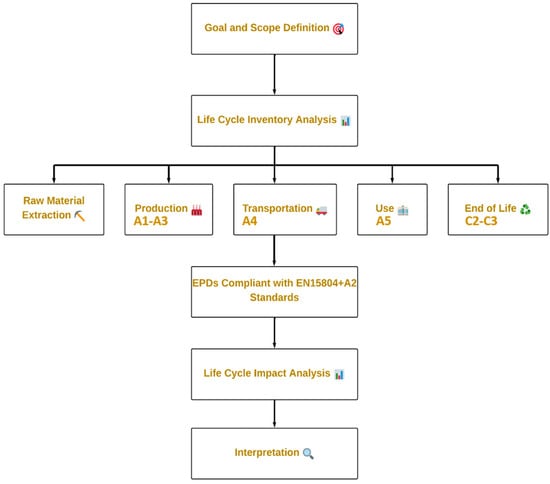 In the goal and scope definition phase, a cradle-to-gate and end-of-life stages scope was established, including the life cycle stages of raw material extraction, production, transportation, maintenance, and end-of-life, to ensure a holistic assessment of each material’s environmental impact, from sourcing to final disposal or recycling [68].
