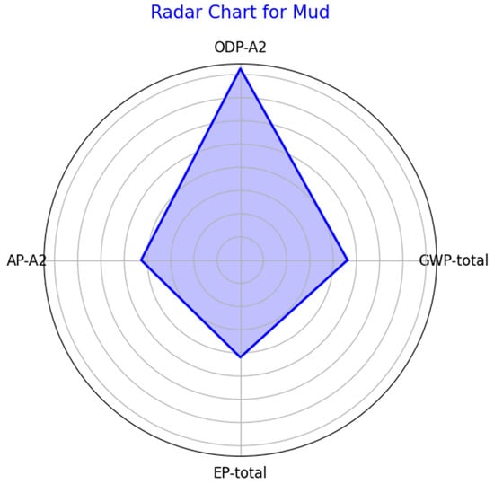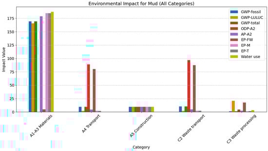 The life cycle impact assessment (LCIA) for mud (Figure 4) reveals significant environmental contributions across various stages, with the GWP and other key indicators showing notable trends. The GWP from fossil fuel sources during the materials stage (A1–A3, see Figure 2 to connect to the scheme) is relatively high, amounting to 169.22 kg CO2-eq. This reflects the energy-intensive processes involved in extracting and processing mud. Transportation (A4, see Figure 2 to connect to the scheme) adds 9.57 kg CO2-eq, while the construction phase (A5) introduces a slightly lower contribution of 9.52 kg CO2-eq. At the waste transport stage (C2), the GWP increases to 10.45 kg CO2-eq, primarily due to the movement of discarded materials, while waste processing (C3) contributes a relatively minor 1.23 kg CO2-eq.