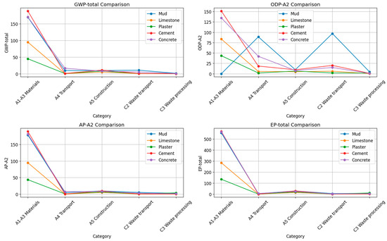 The comparison between mud and limestone (Figure 6) demonstrates that, while mud has a higher overall GWP, limestone shows a substantial impact in other areas such as water use, acidification, and eutrophication. Both materials exhibit significant environmental impacts across their life cycles, but their profiles differ markedly depending on the specific category considered. Mud has a higher carbon footprint and resource use during the materials and waste stages, while limestone’s environmental burden is more pronounced in terms of acidification, eutrophication, and ozone depletion during the extraction and production stages.