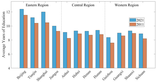 Average educational attainment across China’s three regions: 2011 vs. 2021. Note: Data are obtained from the China Statistical Yearbook. Average years of education = (Primary × 6 + Junior high × 9 + Senior high × 12 + College and above × 16)/Population aged 6+. The eastern, central, and western region classification follows China’s official division established in 1986, with each region containing approximately 10 provincial-level divisions (provinces/autonomous regions/municipalities). Four provincial-level divisions with the highest population density were selected from each region, as dense populations (1) maximize the internet’s public good value, (2) indicate higher population mobility, and (3) maintain stable regional rankings over time.