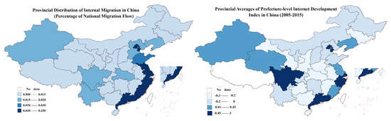 Provincial migration patterns and internet development status. Note: Provincial migration status is measured by the ratio of out-migrants with non-local household registration to total national migrants. Migration data were obtained from the 2015 National 1% Population Sample Survey of China. For each province, the internet development index was calculated as the mean value of all its prefecture-level cities.