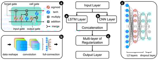 A structure diagram of MR LSTM-CNN. The core neural unit of the LSTM Layer is shown in (a), and the main steps of CNN are depicted in (b). The topological structure including L2 and dropout layers for regularization is in (c).