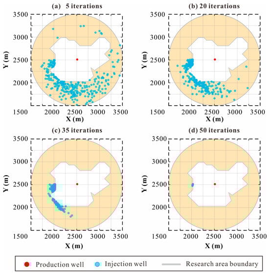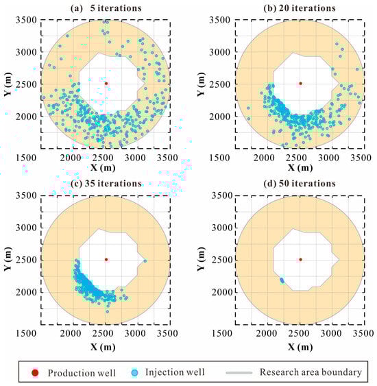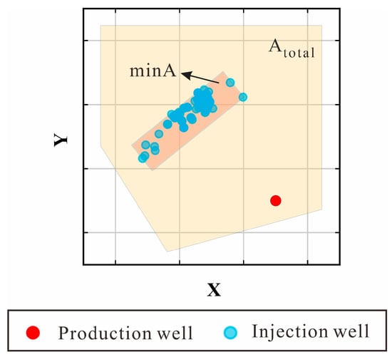 where is the sample average objective function value (i.e., the average economic cost, CNY; see Equation (7)) at the present iteration, is the sample minimum objective function value (i.e., the minimum economic cost, CNY) at the present iteration, is the area of a rectangle that can contain all samples and owns the smallest area (m2), and is the total area of the simulation area (m2, shown in Figure 2).