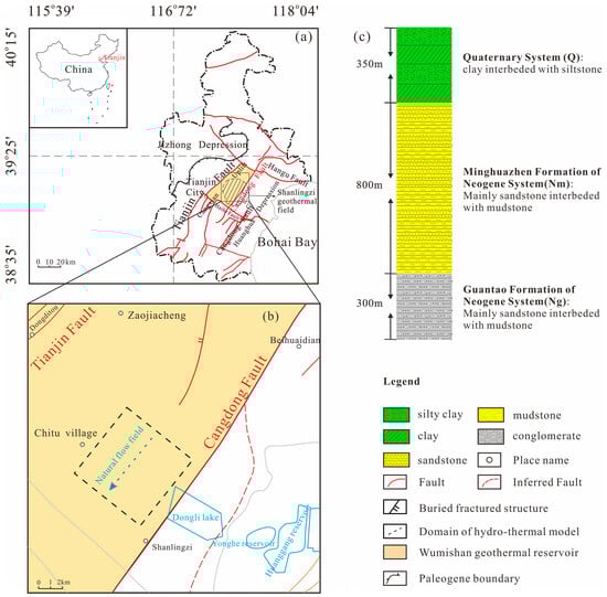 The Panzhuang Geothermal Reservoir (PGR), situated in the northeastern part of Tianjin (see Figure 4a), is one of the key geothermal reservoirs within the North China Plain. Since the 1980s, around 70 geothermal wells have been drilled in this region, primarily for geothermal heating and hot spring therapy []. The PGR is bordered by the Cangdong Fault, Tianjin Fault, Hangu Fault, and Haihe Fault. Among them, the Cangdong Fault is a compressional–torsional and normal fault dipping southeastward with an inclination of 30° to 45°.
