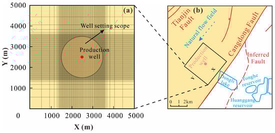 A discretization method with sparse grids away from the production well and dense grids near the production well was employed in this study, using single-layer rectangular grids (see Figure 5a). Additionally, the natural flow field is considered in the hydro-thermal model, with the flow direction from northeast to southwest (see Figure 5b) and a pressure gradient of 0.075 MPa/m [].