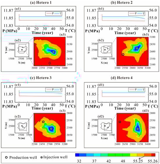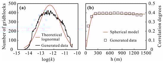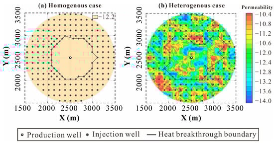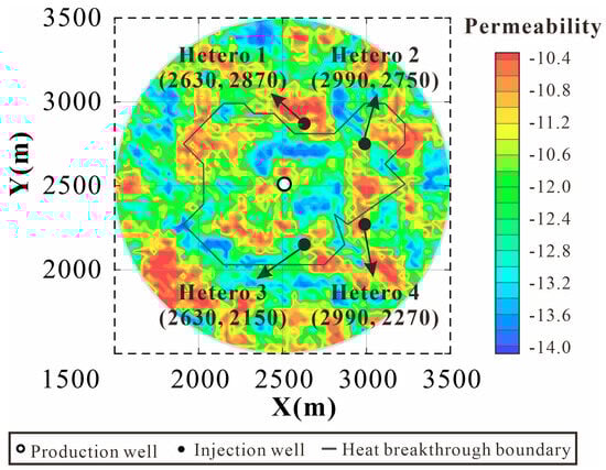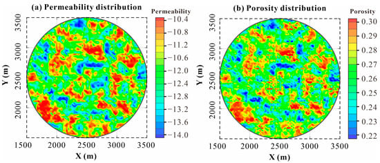 The specific geological parameters and their detailed information are shown in Table 1. The burial depth of the roof of the Minghuazhen Formation involved in the modeling is 800 m, and its thickness is 400 m. When the reservoir is regarded as a homogeneous aquifer, the permeability of the reservoir is set to 6.918 × 10−13 m2, and the porosity is 0.259. These two parameters are also used as the average values of permeability and porosity in the heterogeneous model. The water temperature of the aquifer is 55.26 °C, and the reinjection temperature is 30 °C.