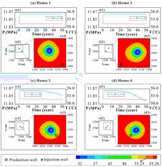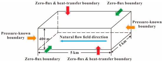 The geothermal reservoir is regarded as the Equivalent Porous Medium (EPM) [], where water flow obeys Darcy’s law [].