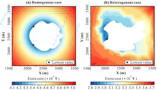 where and are the polar radius (m) and the polar angle (rad), respectively, in polar coordinates; is the cumulative value of surrogate model output (i.e., the cumulative value of an economic cost time series, CNY); and is the radius of the heat breakthrough boundary at a specific angle (m).