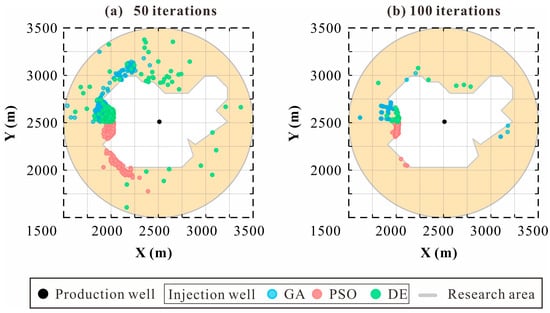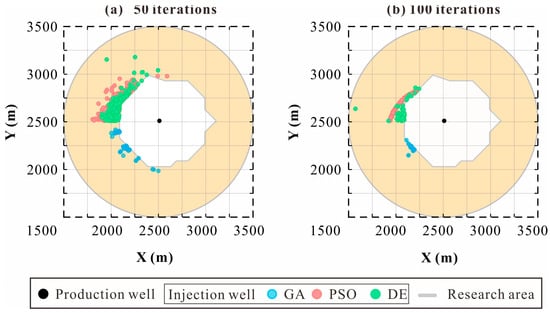 The optimization of well placement, after the building of surrogate models, aims to figure out the best relative angle and distance between the production well and injection well. By employing an optimization algorithm, the optimal solution of good placement can be continuously approximated under the objective function based on optimization strategies. The optimization strategies and objective functions are various from different production sites and demands. The net present value (NPV) was used by Helgason [] to optimize the well placement. And Song et al. [] optimized the well placements by adjusting the operational parameters like injection temperature, injection flow rate, etc. Additionally, multi-objective optimization strategies such as ‘minimum reservoir pressure difference + maximum average cumulative enthalpy’ [], ‘highest production temperature + minimum change of reservoir pressure’ [], and ‘maximum productivity + minimum cost’ [] are also considered to optimize the placement of a well doublet. The optimization algorithm for the objective function is mainly divided into specialized optimization frameworks and intelligent algorithms. Zhang et al. [] proposed a multiple-step methodology for geothermal well placement optimization and figured out that the injection wells are suggested to be placed upstream of the production wells. And Blank et al. [] used a framework that combined finite element and gradient-free optimization methods to optimize the well placement and achieve sustainable production in the Great Munich region. However, achieving satisfactory portability and computational efficiency remains a challenging task for these specialized frameworks []. With the development of AI technology, optimization algorithms like a Genetic Algorithm (GA) [,,], Cat Swarm Optimization Algorithm (CSO) [], and Particle Swarm Optimization (PSO) [] gradually show their advantages in well placement optimization. Despite overcoming the shortcomings of traditional frameworks, an intelligent algorithm still faces issues such as getting trapped in local optima and encountering complexities in parameter tuning [,]. More advanced intelligent optimization algorithms are demanded to cope with the issues mentioned and fit well placement optimization problems.