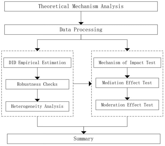 To evaluate the impact of FTZ policies on carbon emissions, this study employs the difference-in-differences (DID) method. The DID approach compares changes in carbon emissions between pilot provinces that implemented FTZ policies and control provinces that did not before and after the policy implementation. This method effectively eliminates the influence of other potential factors, allowing for an accurate estimation of the causal effects of the policy. Compared with other methods, DID addresses endogeneity issues, avoiding reverse causality between the policy and carbon emissions. It also accounts for the temporal and spatial variations in policy implementation, providing a more precise effect evaluation. Alternative methods, such as cross-sectional analysis and panel data regression, were considered. However, these methods are insufficient in resolving endogeneity issues, as the policy may be influenced by prior trends in carbon emissions and fail to control for dynamic effects after policy implementation. Therefore, the DID method is the most appropriate choice for this study. The overall research framework is illustrated in Figure 1.