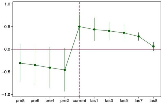 The key assumption of the difference-in-differences (DID) method is that, prior to the policy intervention, the treatment and control groups should follow parallel trends. To verify this assumption, we adopted the methodology of Nawaz, M. A. (2021) [28], examining the trend changes for both groups from 2005 to the final year of the sample. The results of this analysis are presented in Figure 2. The findings show that all regression results for the pre-policy period are statistically insignificant, indicating that the trends for the treatment and control groups were consistent before the establishment of FTZs, with no significant differences. Conversely, after the implementation of FTZs, the experimental group experienced a significant reduction in carbon emissions relative to the control group. Therefore, the parallel trend assumption for DID estimation is satisfied.