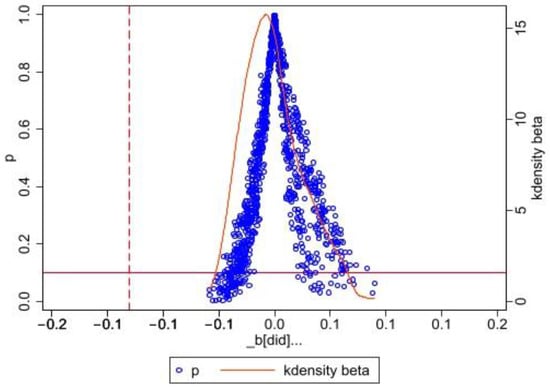 A total of 1000 random samples were generated, and baseline regressions were performed using Equation (1). Figure 3 illustrates the mean regression estimates from the 1000 random assignments, showing that the average DID estimates range between −0.1 and 0.1. Furthermore, Figure 3 presents the distribution of the 1000 estimated coefficients along with their associated p-values. The distributions are concentrated near zero, with most p-values exceeding 0.1. In contrast, the actual regression coefficient obtained in this study stands out as a clear outlier in the placebo test. These results confirm that the baseline regression is not driven by randomness and thus possesses policy reliability.