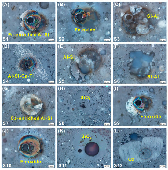 The mineralogy and LA-ICP-MS analysis spot of different phases in coal fly ash under reflected light. (A) S1, Al-Si-Fe; (B) S2, Fe-oxide; (C) S3, Si-Al; (D) S4, Al-Si-Ca-Ti; (E) S5, Al-Si; (F) S6, Si-Al; (G) S7, Al-Si-Ca; (H) S8, SiO2; (I) S9, Fe-oxide; (J) S10, Fe-oxide; (K) S11, SiO2; (L) S12, quartz.