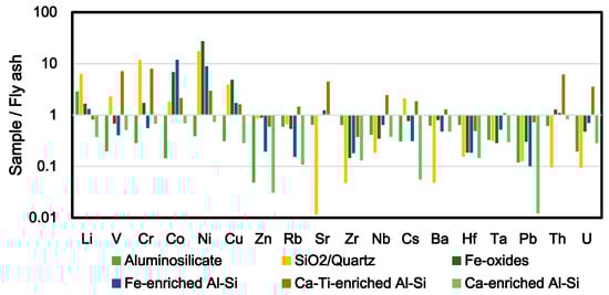 A total of 34 trace elements, including REEs and Y, were detected in the coal fly ash using LA-ICP-MS as shown in Table 2 and Table 3. Trace elements were distributed in variations among different phases of fly ash. Figure 3 illustrates the in situ distribution of trace elements of aluminosilicates, Fe-oxides, and SiO2 in coal fly ash compared to the ICP-MS test results of bulk coal fly ash. Lithium is the only enriched trace element for the pure aluminosilicates phase, while significant concentrations of Li are also found in the SiO2/quartz phase. Most trace elements represent a similar distribution in the two Fe-enriched phases: Fe-oxides and Fe-enriched aluminosilicates. Cobalt, Ni, and Cu co-exist in the Fe-enriched phases as well as in SiO2/quartz and Ca-enriched aluminosilicates. The majority of the remaining enriched elements (V, Cr, Sr, Nb, Cs, Ba, Th, and U) occur in the Al-Fe-enriched aluminosilicates. Other enriched elements such as Zn, Zr, Hf, Ta, and Pb, are mainly found in the Al-Fe-enriched aluminosilicates, with major phases shown in Figure 3, indicating that they are concentrated in the other un-identified or small-sized particles (such as heavy minerals) in the fly ashes. Among the Fe-oxides and Fe-enriched aluminosilicates, Cr, Zn, and Ba showed distinct concentrations. The concentrations of Co, Ni, and Cu in these two Fe-rich particles are much higher than that of others.