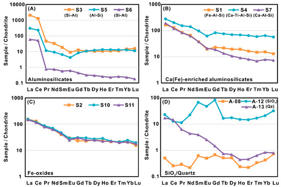 The distribution patterns of REE in the aluminosilicates (A), Ca, (Fe)-enriched aluminosilicates (B), Fe-oxides (C), and SiO2/quartz (D).
