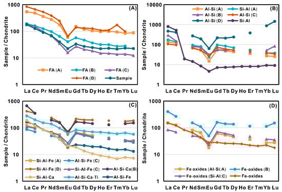 The distribution of REY of fly ash (A) measured by ICP-MS and that of aluminosilicates, Ca (B), (Fe)-enriched aluminosilicates (C), and Fe-oxides (D) was determined by LA-ICP-MS.