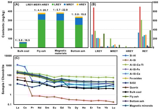 The proportions of LREY, MREY, and HREY of feed coal and coal combustion products such as coal fly ash and coal bottom ash are discussed to explore the distribution and occurrence of REY during the coal combustion process, as Figure 6A shows. The content of REY in fly ash is 383.48 mg/kg, six times higher than that of feed coal (63.20 mg/kg) and slightly lower than that of the world value of 404 mg/kg in coal ash [2]. The content of REY in bottom ash (340.97 mg/kg) is five times more enriched than feed coal, slightly lower than that of fly ash. The distribution of REY in magnetic materials is similar to that of fly ash, with REY content of 386.88 mg/kg. The partition ratio of LREY, MREY, and HREY in feed coal, fly ash, magnetic materials, and bottom ash corresponds to 1:5.8:18.5, 1:4.1:20.7, 1: 5.7:22.9, and 1:5.8:19.0, respectively. The partitions of LREY, MREY, and HREY are approximate between feed coal and bottom ash. The redistribution of REY occurs in the combustion process from coal to fly ash, where the proportion of LREY increases significantly and the proportion of HREY slightly decreases. Among the magnetic materials, MREY and HREY are more concentrated in fly ashes.